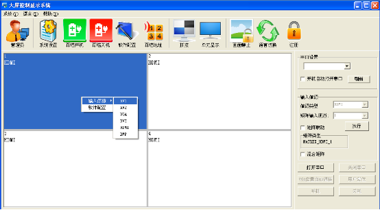 選擇多個拼接單元,2x2為例,選中4個屏后,在信源中選擇信號源,單擊“執行”按鈕完成拼接,點擊“圖像凍結”可以凍結當前畫面,再次點擊解除靜像。